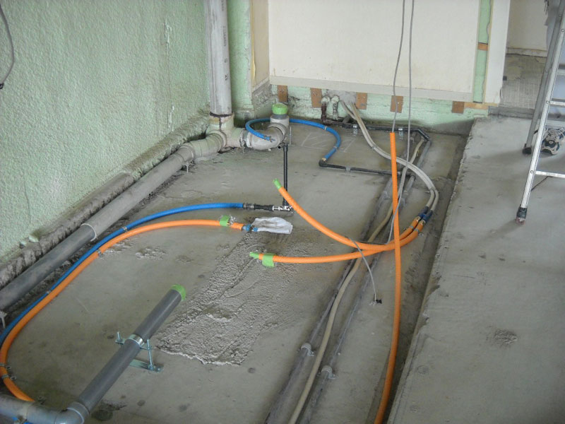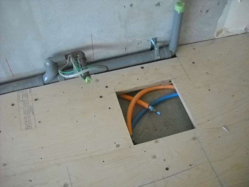 給水管などは床のベニヤを貫通させて床上に固定させる為、