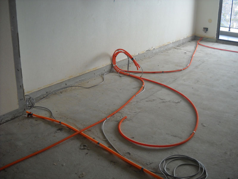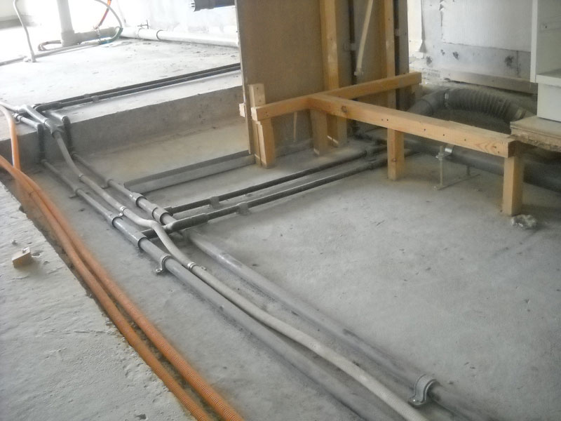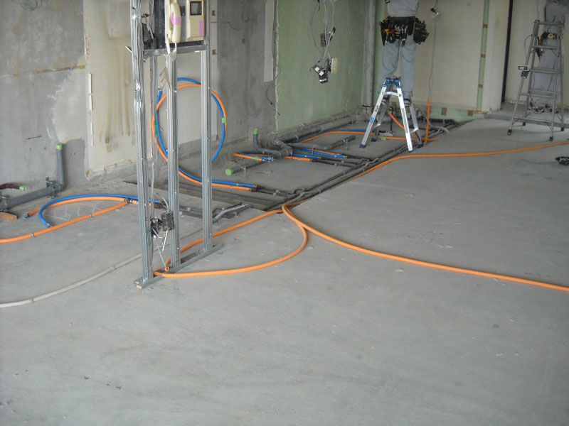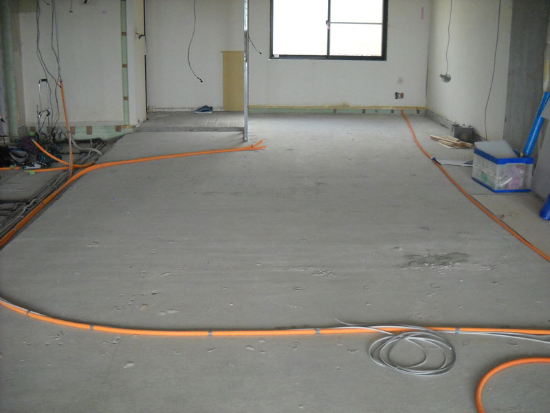 スラブ(コンクリートの床版)の上に配線を流しています。
