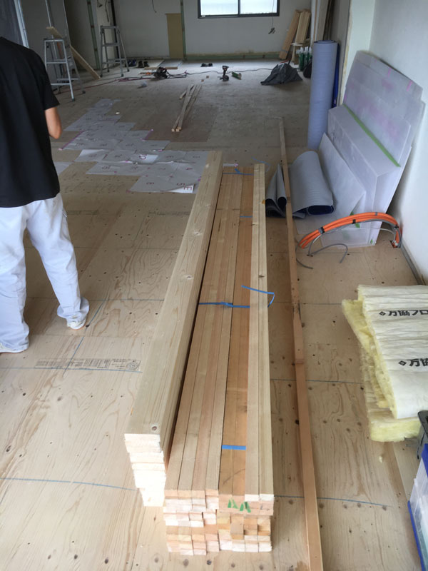 床材が納品されましたので、一気に床を貼ってまいります。