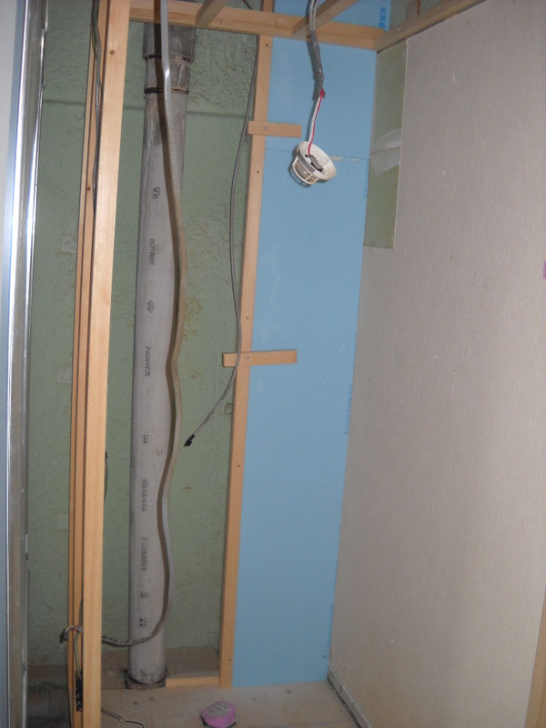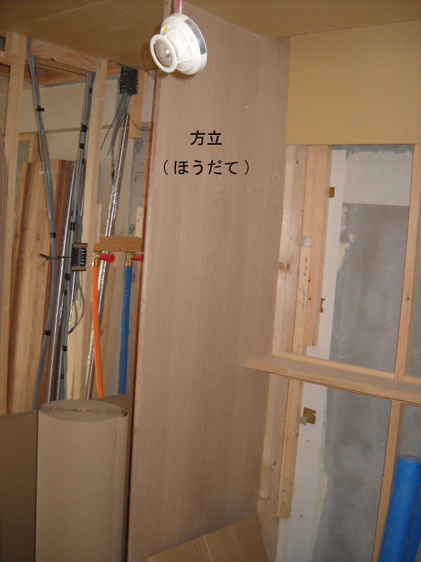 ユニットバス前の壁には、105mmの幅の間柱という材料入れ、