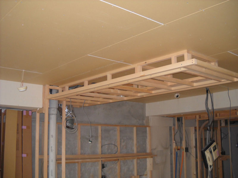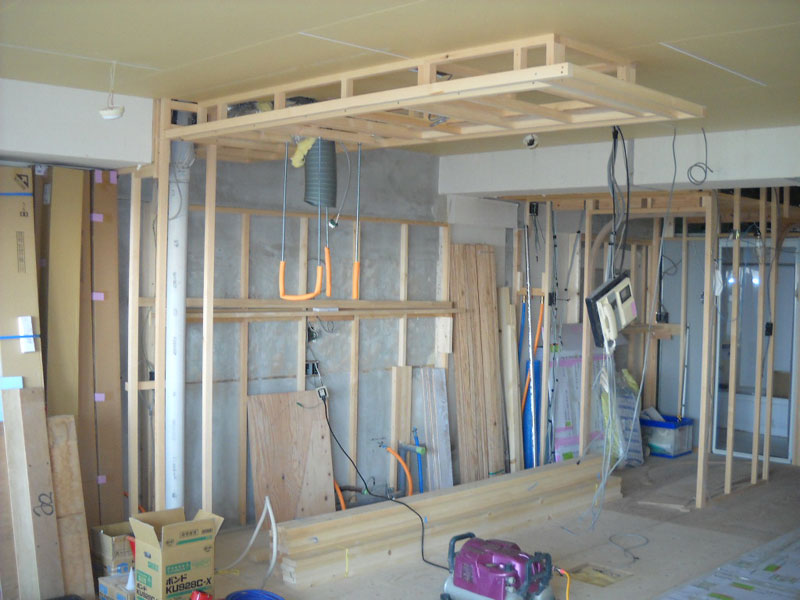 天井の下地組みと引き続き間仕切り壁の工事を行いました。