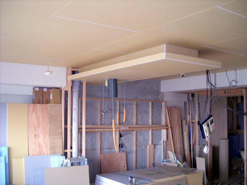 先週紹介させて頂いたキッチン天井に石膏ボードが貼られました。