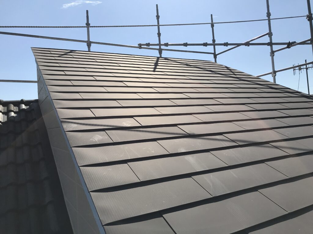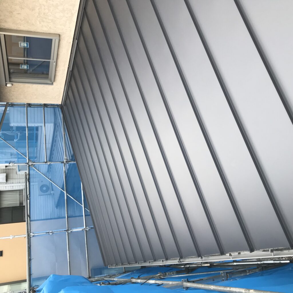 屋根材としてはとても軽く、加工性も良い素材です。耐震的にも有利なので、瓦からの葺き替えやスレートに重ね葺きする際は、このガルバリウム鋼板が採用されます。同じ金属製でも、以前のトタンに比べ格段に錆に強く、対候性が高くなりましたが、塩害地域では採用できません。
