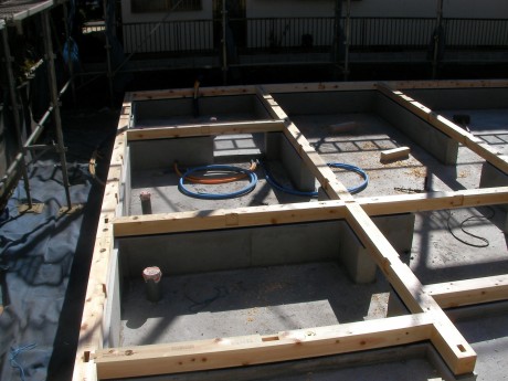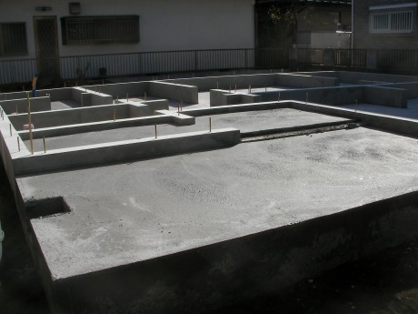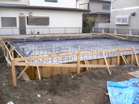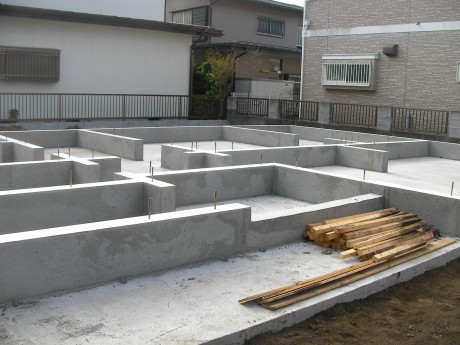 「ベースを打ち込み完了し、立ち上がりを打つための型枠設置状況」