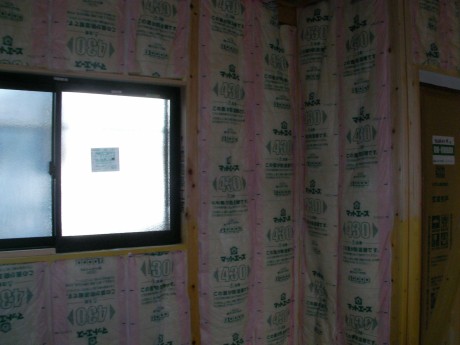 サッシの取り付け、壁断熱材の施工を進めていきます。