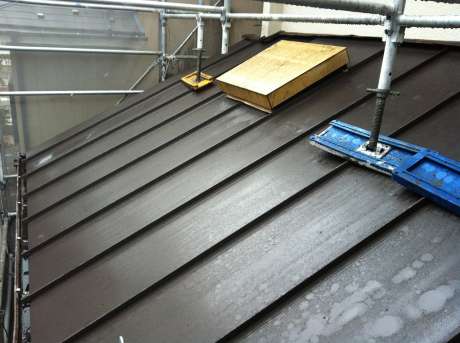 そのトップライトを取付た後、外部では下屋を板金の立てハゼに葺き替えも行いました。