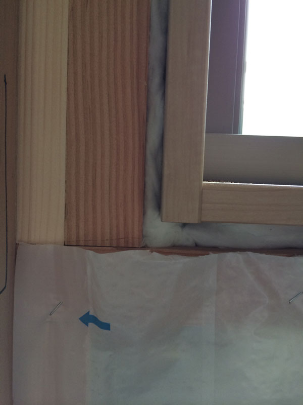 サッシ枠回りの隙間にも断熱材を詰め込みます。