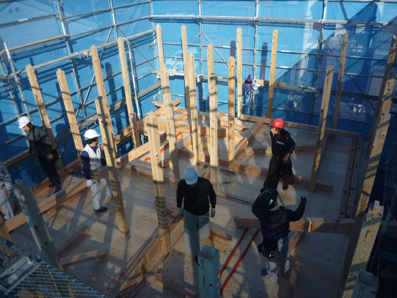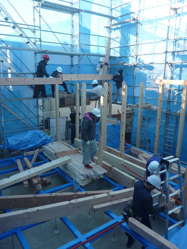 柱を立て、梁を入れて、1階より組上げて行きます。