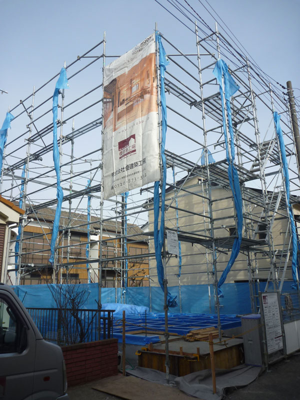今回は、レッカー車が入れない場所の為、人力での建方です。