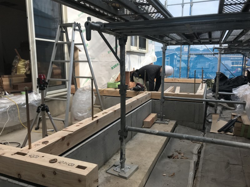 最初は新しく造った基礎の上に、土台を敷いていきます。