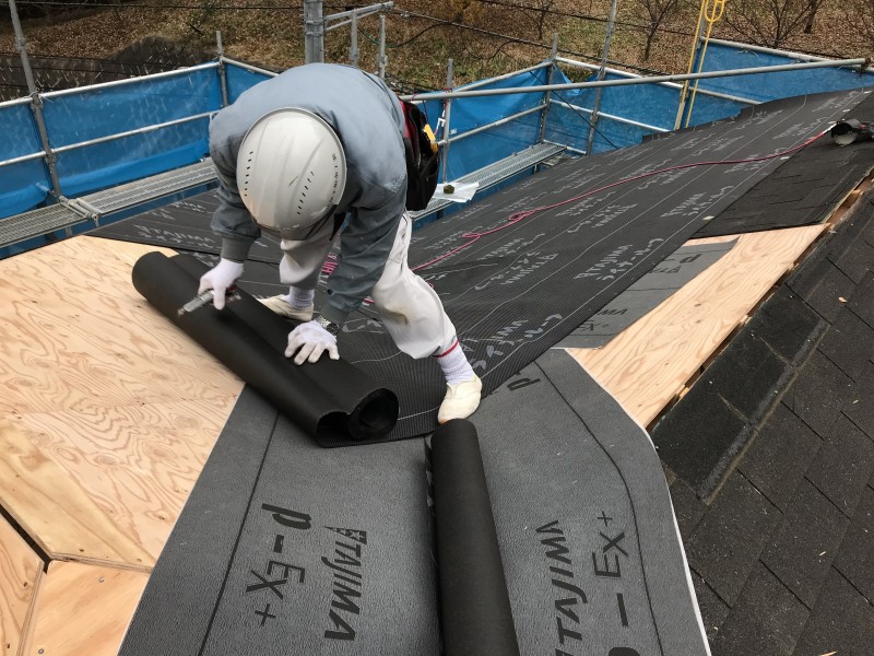次にルーフィング(屋根の防水シート)張りを行って、