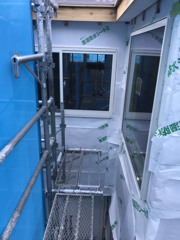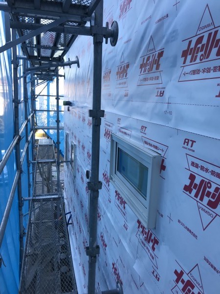 その後、透湿防水シートを外壁全面に張り上げます。