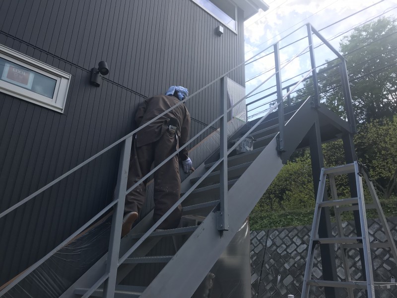 この後、上塗りを施して、鉄骨階段の塗装は完了です。