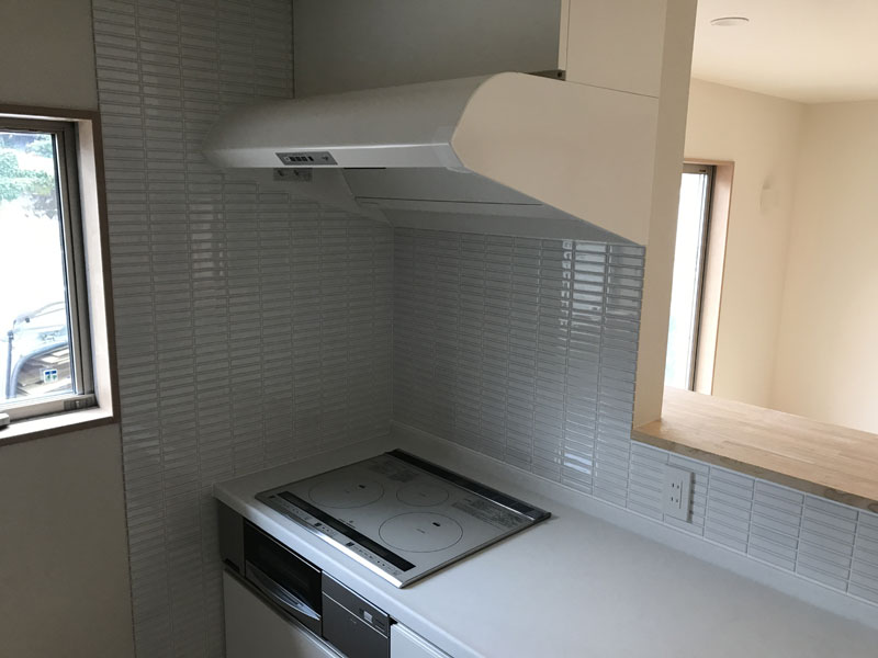 白いタイルに白い目地、そこに白いレンジフードが