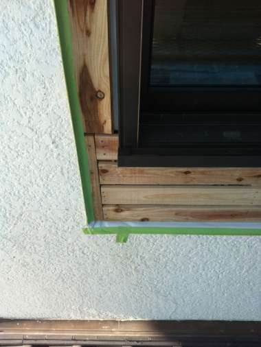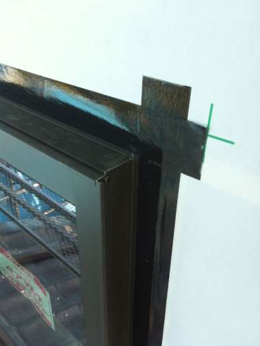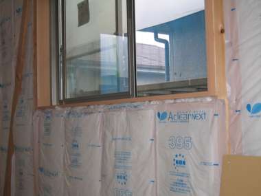 その下地にサッシ設置後、防水テープと透湿防水紙