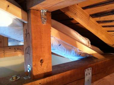 また、屋根裏に隠れていた丸太梁も金物で結びます。