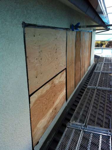 その後、大工さんがサッシの取付をするまでは雨養生を兼ねて、
