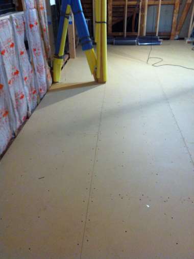 まず、床板を貼る前に、音を軽減するため(T様邸工事は2階の改装工事であり、