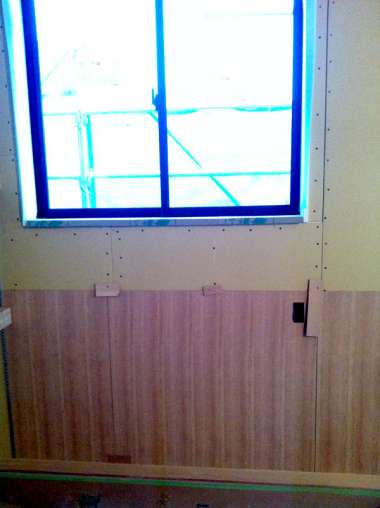 また、腰壁部分に化粧板、アメリカンチェリーの板を貼り進めました。