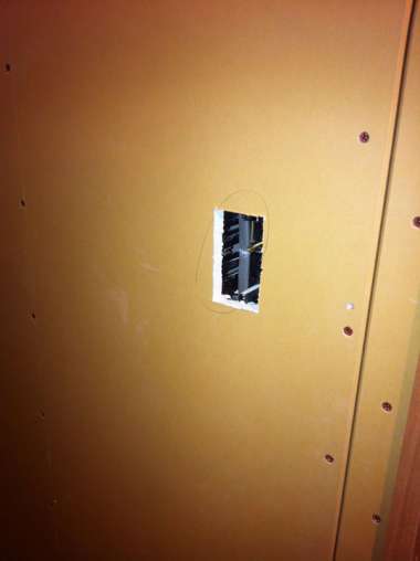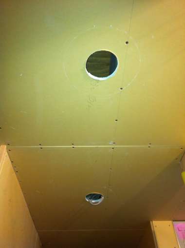 ようやく石膏ボードを天井と壁に留めて行きます。