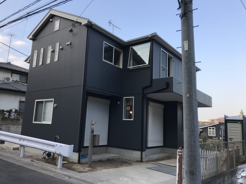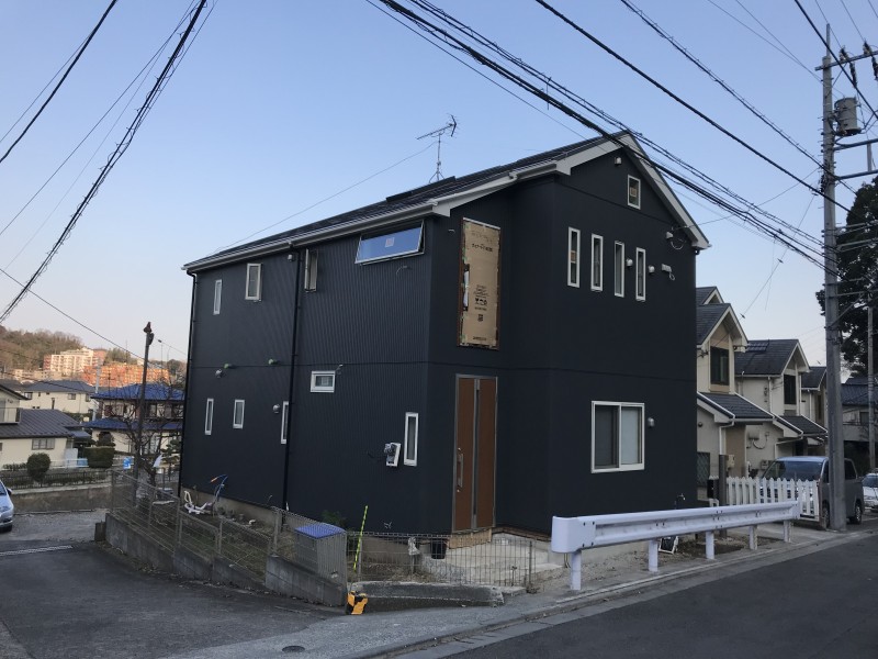 黒系の外壁に、サッシや破風の白が良いアクセントになっています。