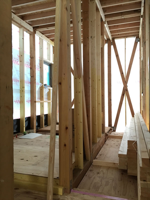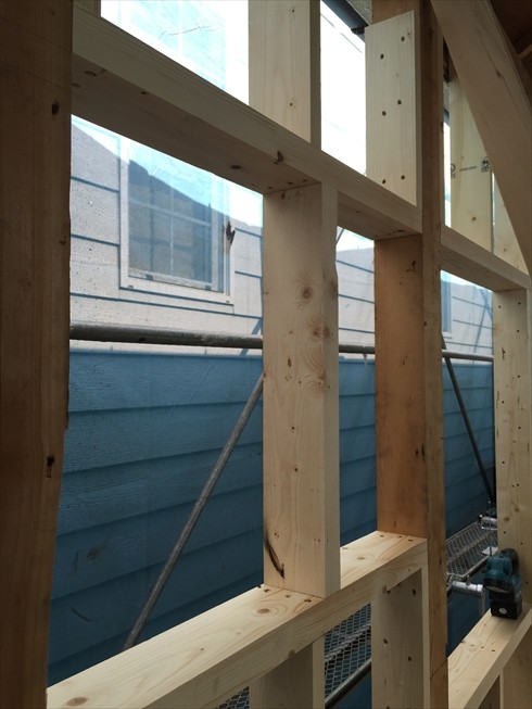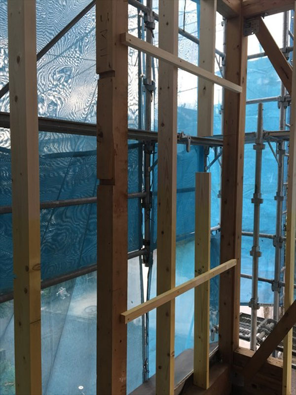 柱と柱の間に、間柱と呼ばれる下地材(柱と比べると薄い材料)を建てていきます。