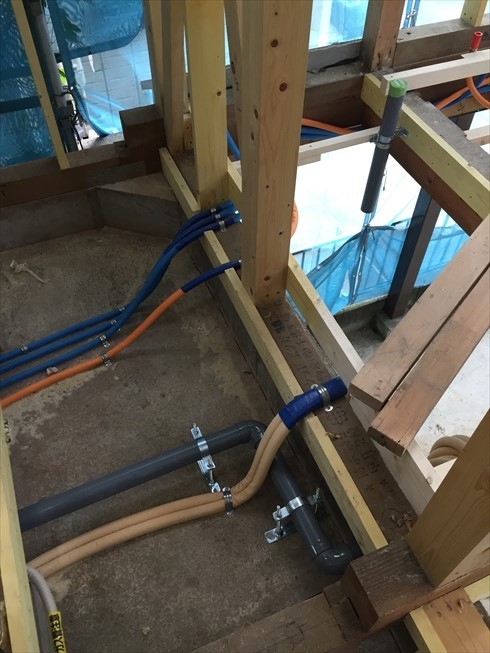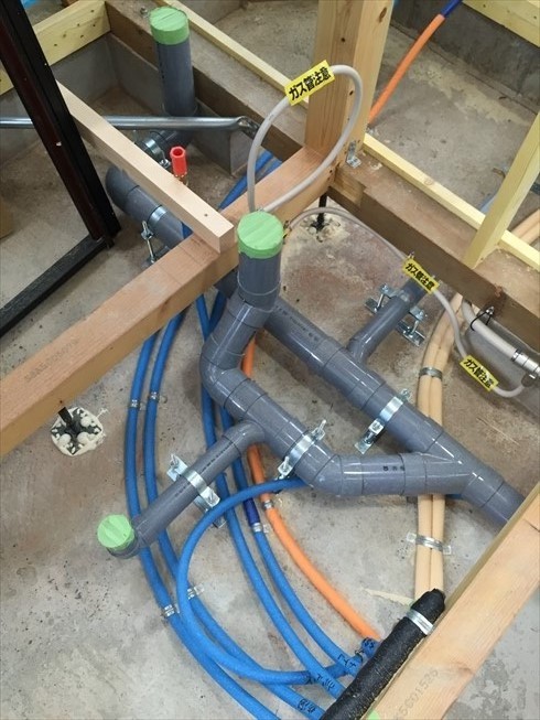 並行して、床下の給排水設備配管・ガス配管を行いました。