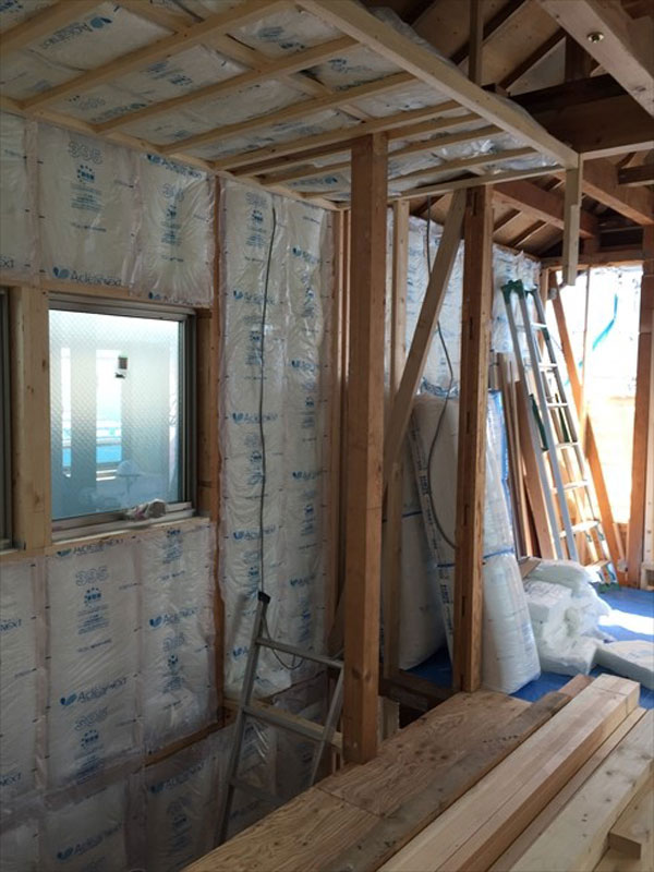 内部は天井の下地組みと合わせて、断熱材の充填を行いました。