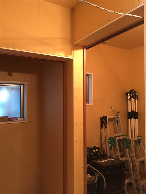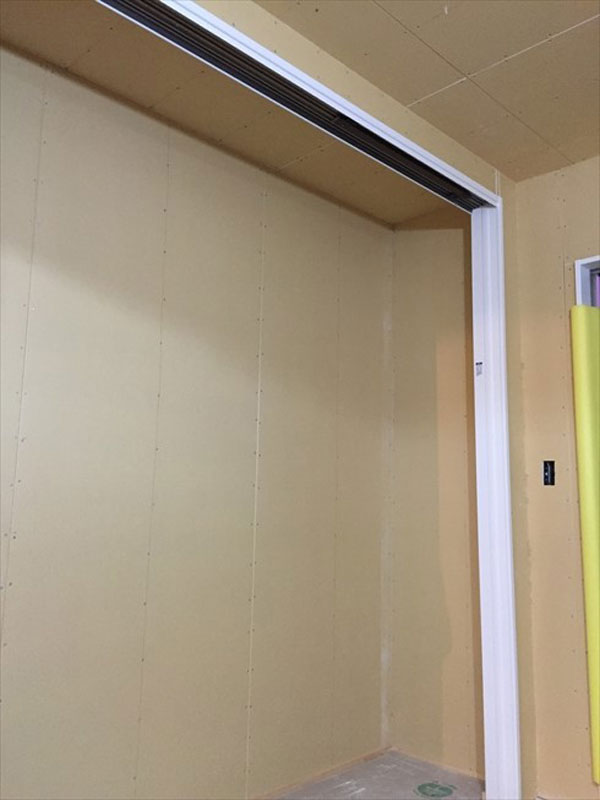 壁面の石膏ボード張りを進めております。