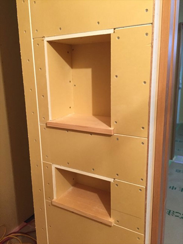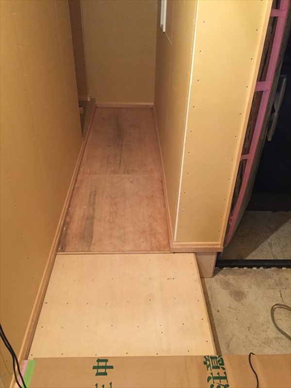 写真下部の白っぽいシナベニヤ下地がタイル張りです。