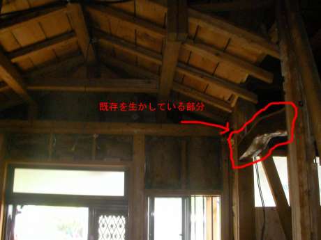 白いきれいな木が、新しく追加した梁、色が焼けて茶色くなっている木が、既存の梁です。