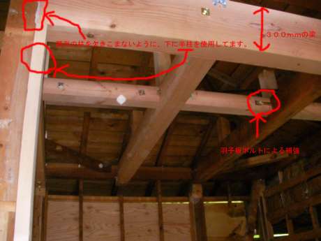 今回は、尺梁とよばれる高さが300mmある大きな梁で補強しました。)