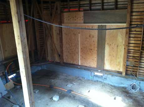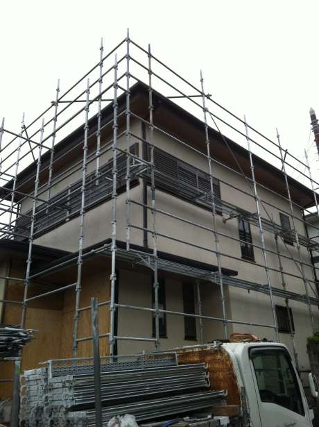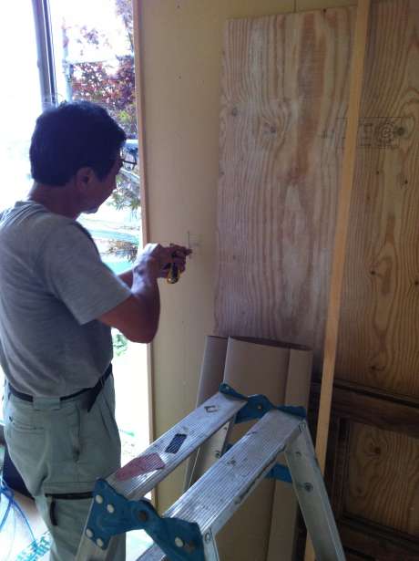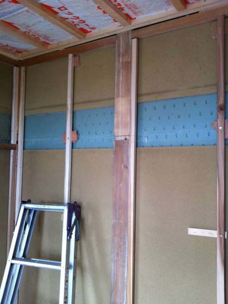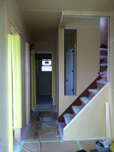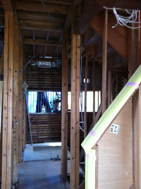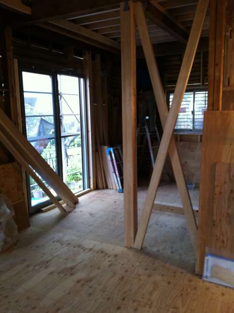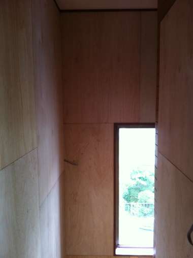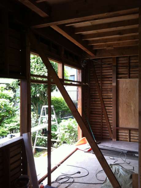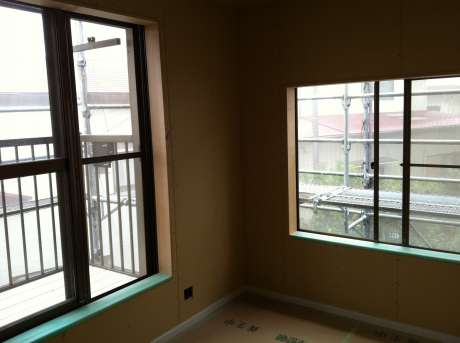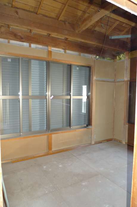 新しいサッシ関係も取付けられ、ベニヤの捨て張りまで完了した状態です。