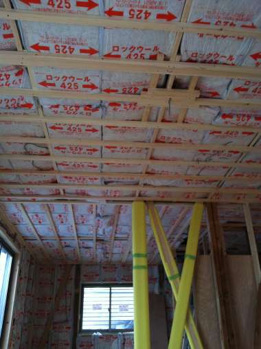 木軸が固まったところで、壁内に断熱材(ロックウール)を充填していきます。