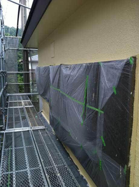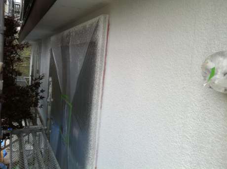 モルタル補修部分は、既存に合わせてパターン(凹凸)を吹きつけてから