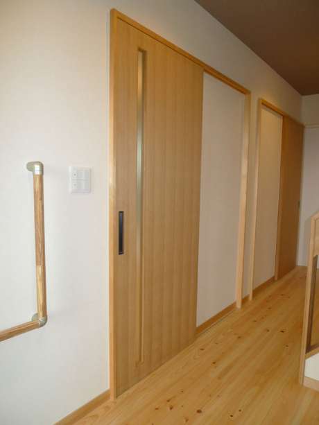 リビングへの出入り口は、タモ材を使ったフラッシュ戸です。
