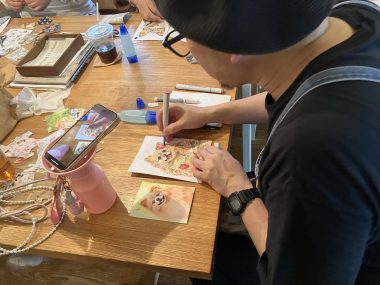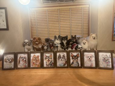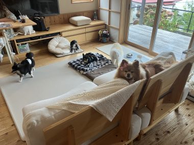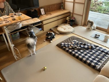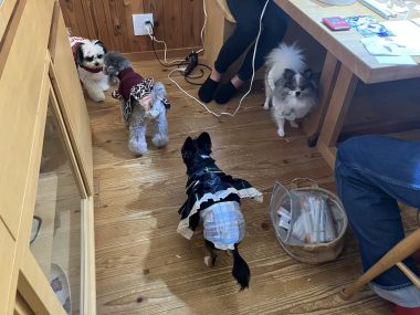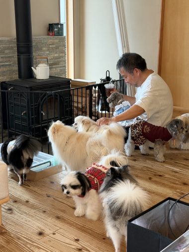 周りには自由に部屋の中で遊びまわる犬たちが(笑)
