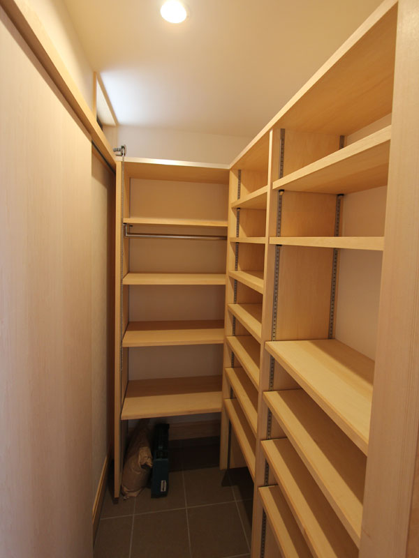 入って正面には収納扉を設けておりますが、