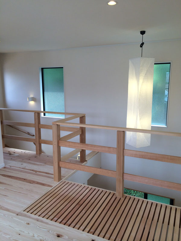 吹き抜けに面した2階廊下の一部を格子状にする事で