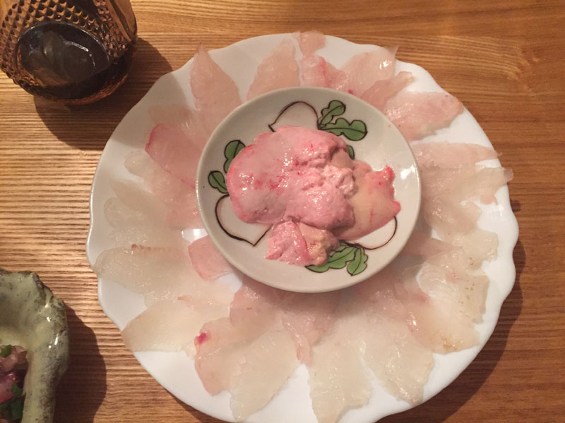 それを捌いて薄造りにして、肝をたっぷりのせていただきました。