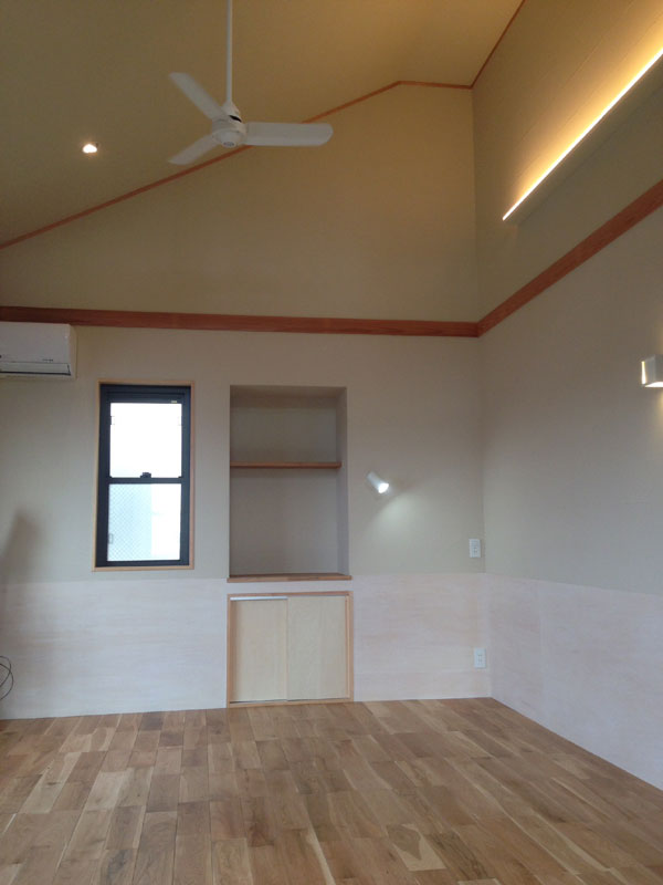 壁は珪藻土と腰下にシナベニヤのホワイト塗装を。