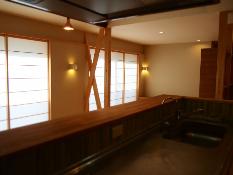 ダイニングテーブル上のペンダントライトの灯を中心に、