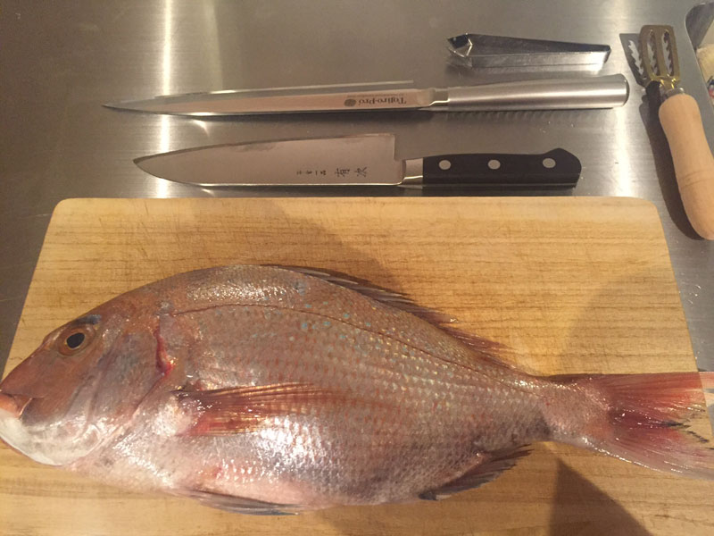 先日にはとてもいい天然ものの鯛が手に入り、身は皮目を焼いた