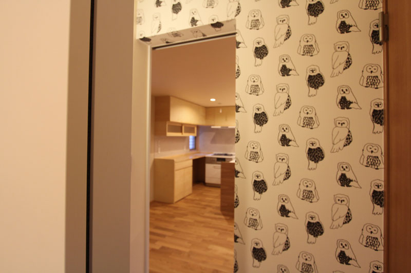 この空間には遊び心でフクロウ柄のアクセントクロスを貼りました。