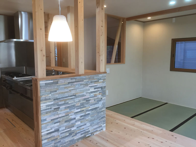 LDKには自然石や珪藻土、無垢材に化粧梁など