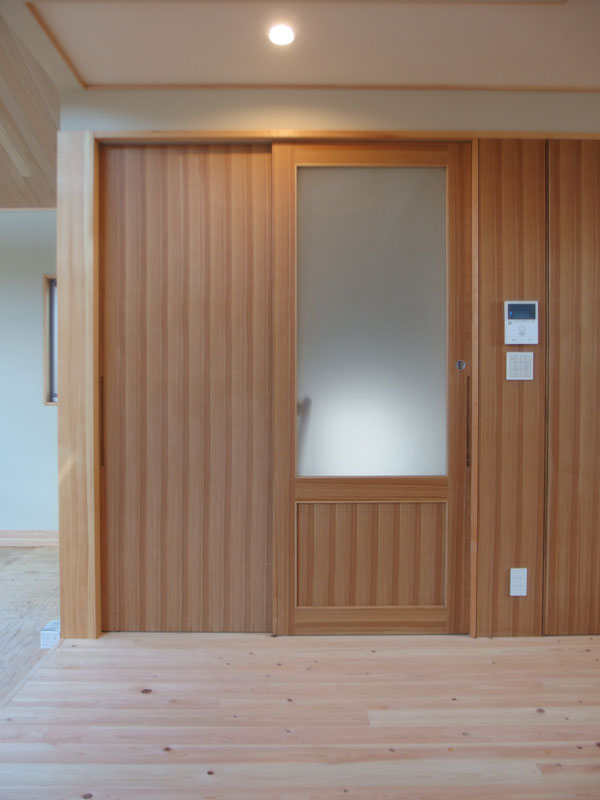 キッチンから見て右側の壁は、タモの突板を張って大きな