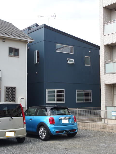ブルーの外壁は窯業サイディング。