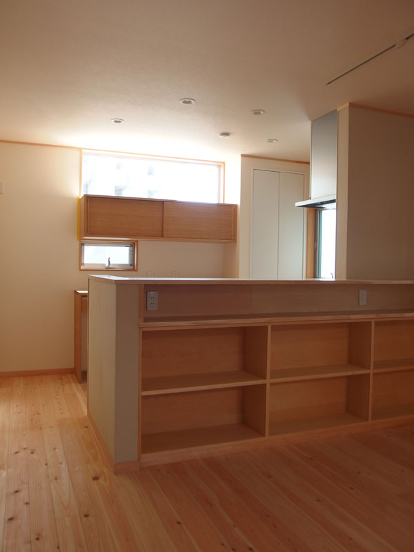 対面キッチンのダイニング側は棚を造作。