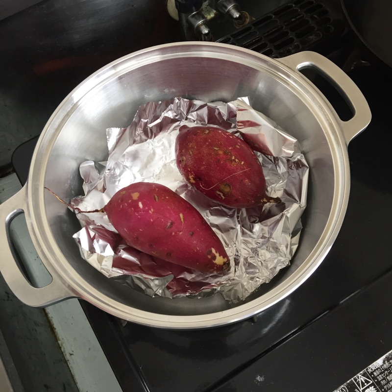 アルミホイルを敷いた鍋にさつまいもを置いて、