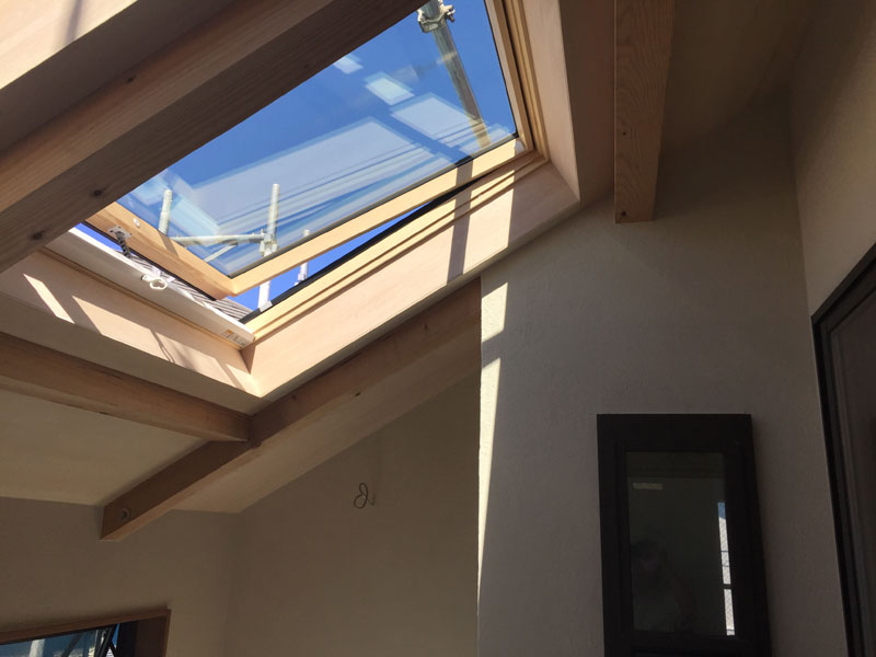 大きなトップライトからの光と力強い木組みがとても雰囲気良く仕上がりました。